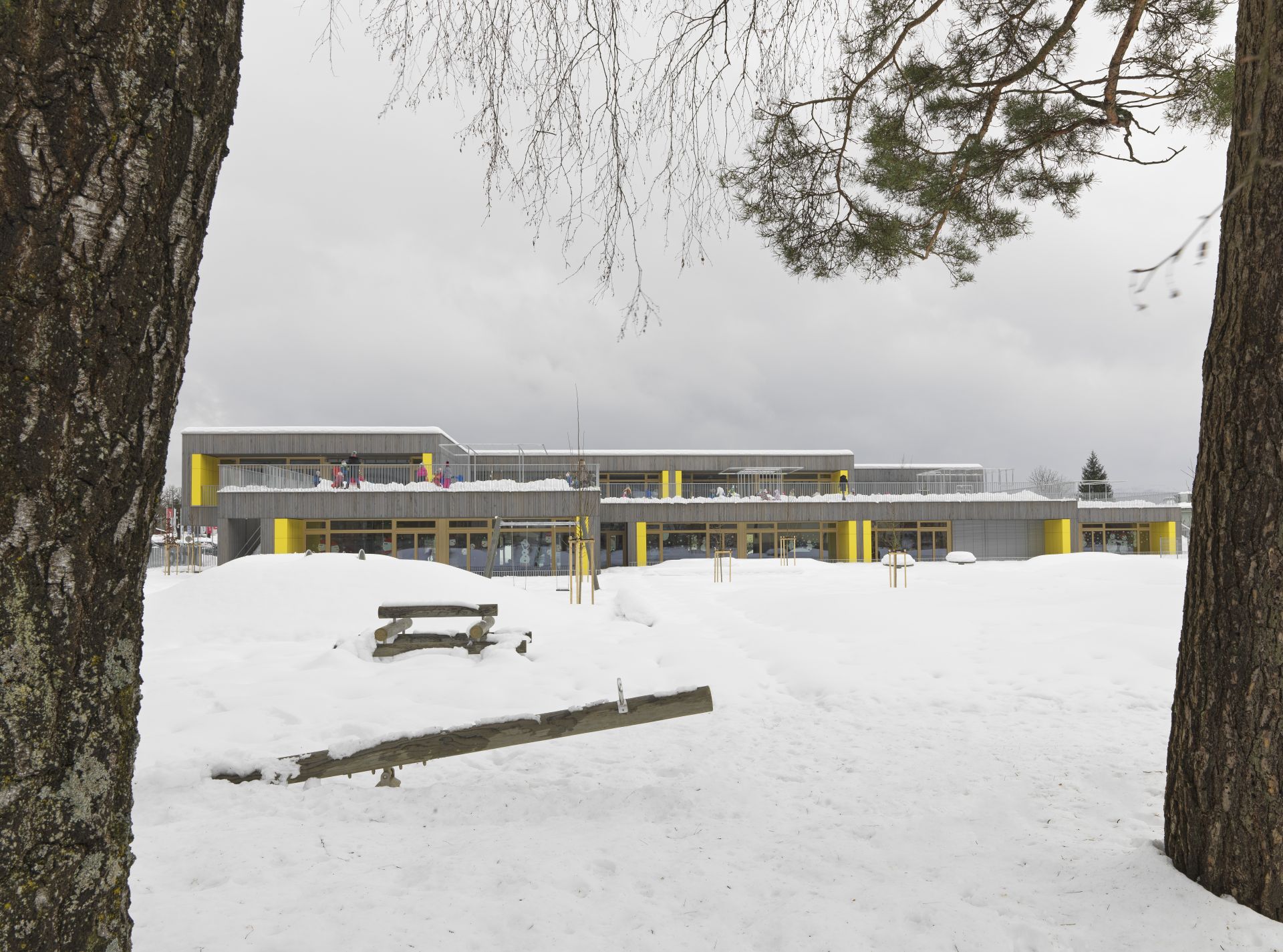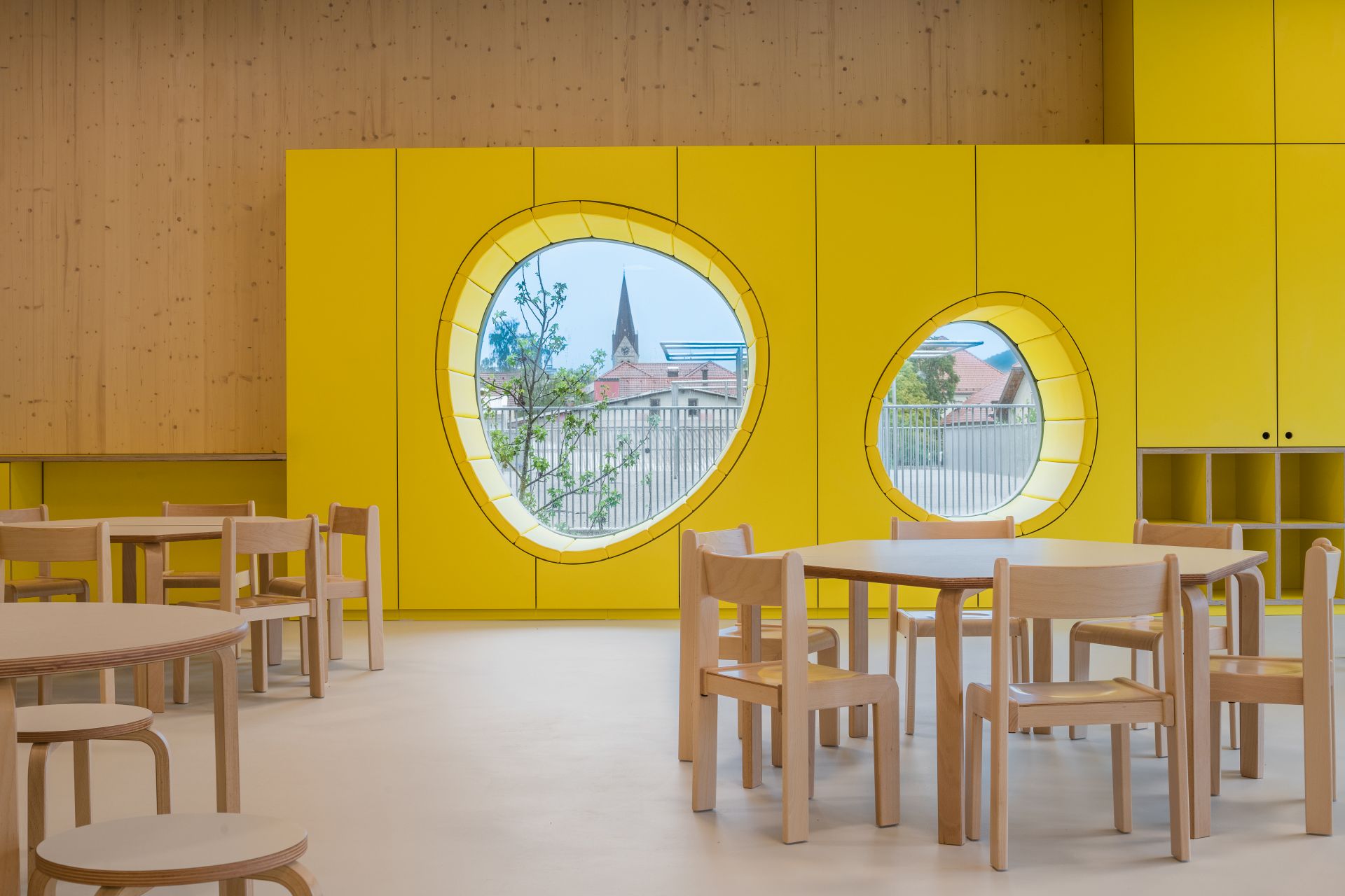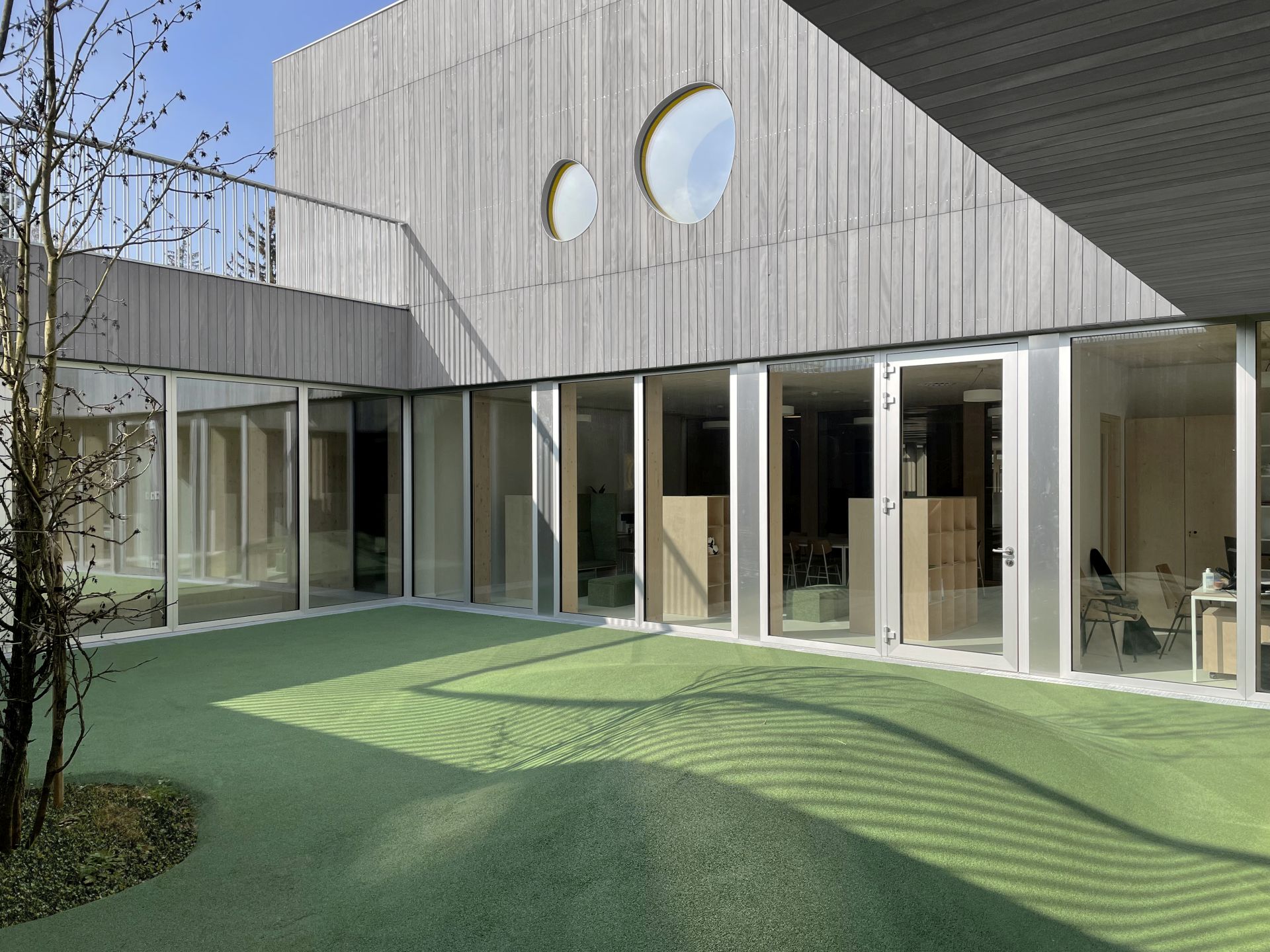 Fasadna opna racionalno zasnovanega volumna objame otroški svet, ga zaščiti in se odziva na notranje vsebine ter otroške aktivnosti. Okno se spremeni v udobno oblazinjeno nišo, ki otroški živžav pripovedno popelje tudi v zunanji svet.
