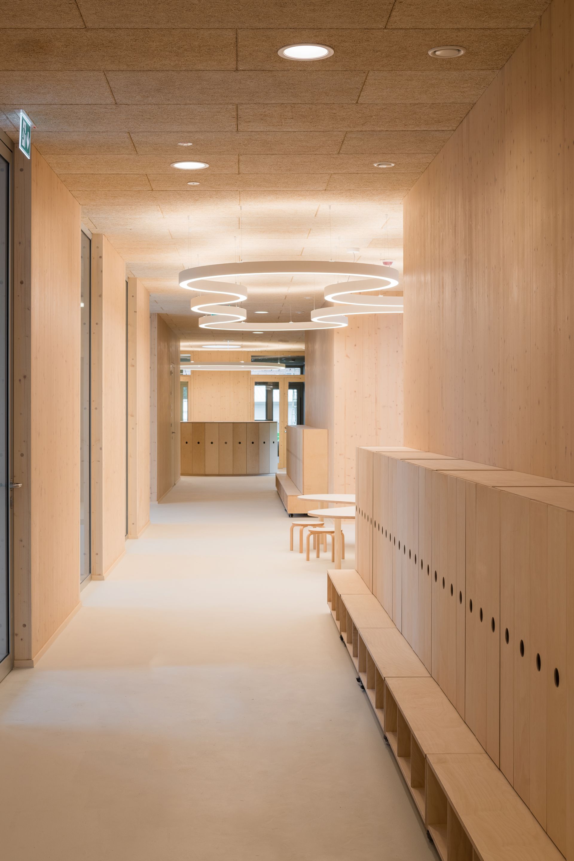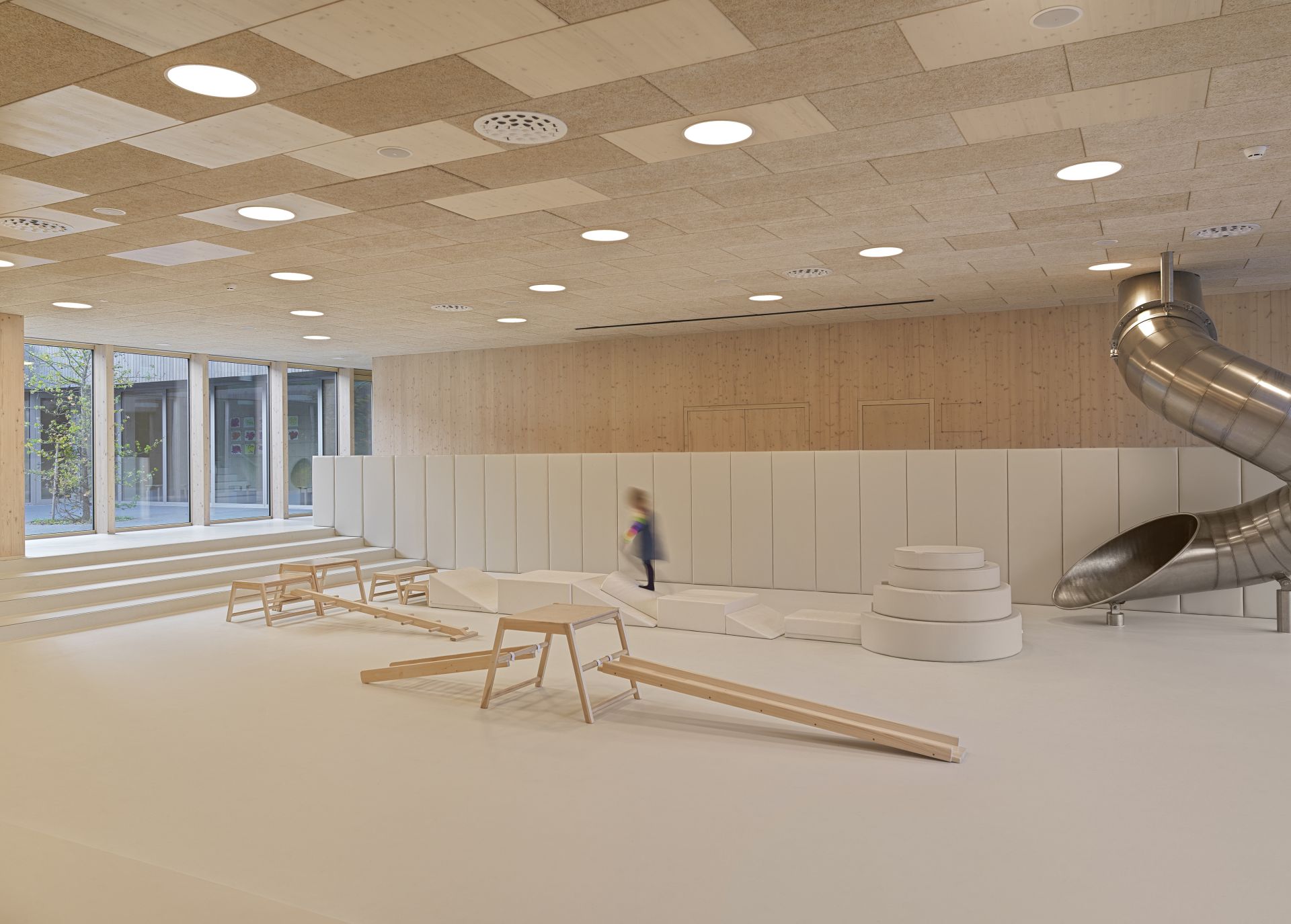 Projekt tipologijo vrtčevske stavbe premišlja na novo. Razčlenjena zasnova relativno velike stavbe se razvija okrog dveh notranjih atrijev, ki služita kot zunanji učilnici in za orientacijo skupne avle, ki deluje kot notranji trg. Prostori so zasnovani kot vizualno in fizično pretočna vzgojno-igralna krajina, ki omogoča potek več različnih aktivnosti hkrati. Programi so razmeščeni tako, da osnovna opravila, kot je priprava hrane, postanejo del vsakdana otrok. Oblikovanje in umestitev integriranega pohištva iz prostorov ustvarja poligon za vsakodnevna doživetja otrok in jih aktivno vključuje v vse dnevne dinamike vrtca, s čimer gradi skupnost. Vrtec postane otroško mesto v malem.