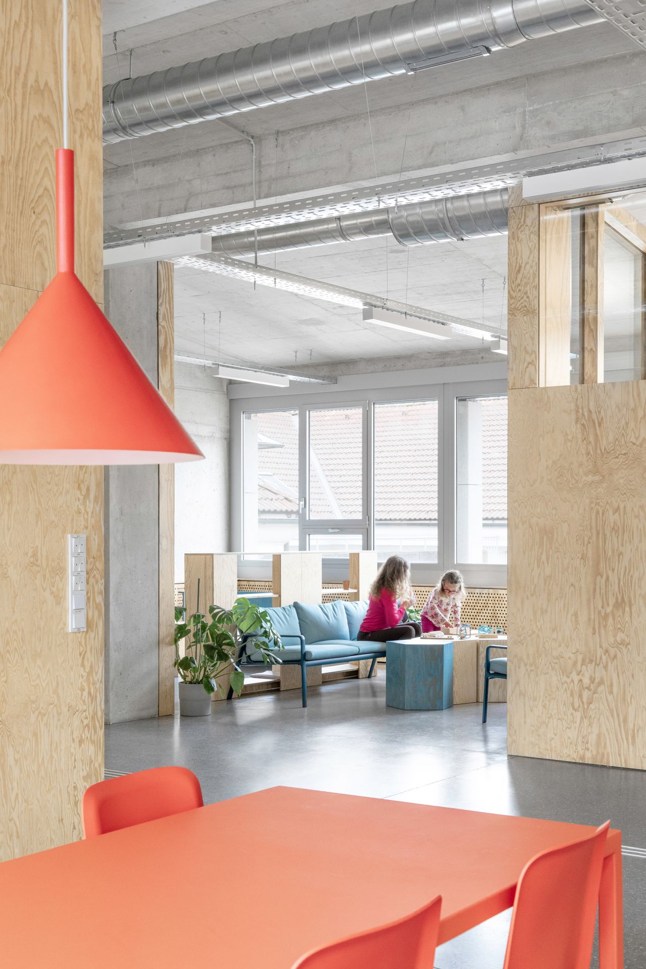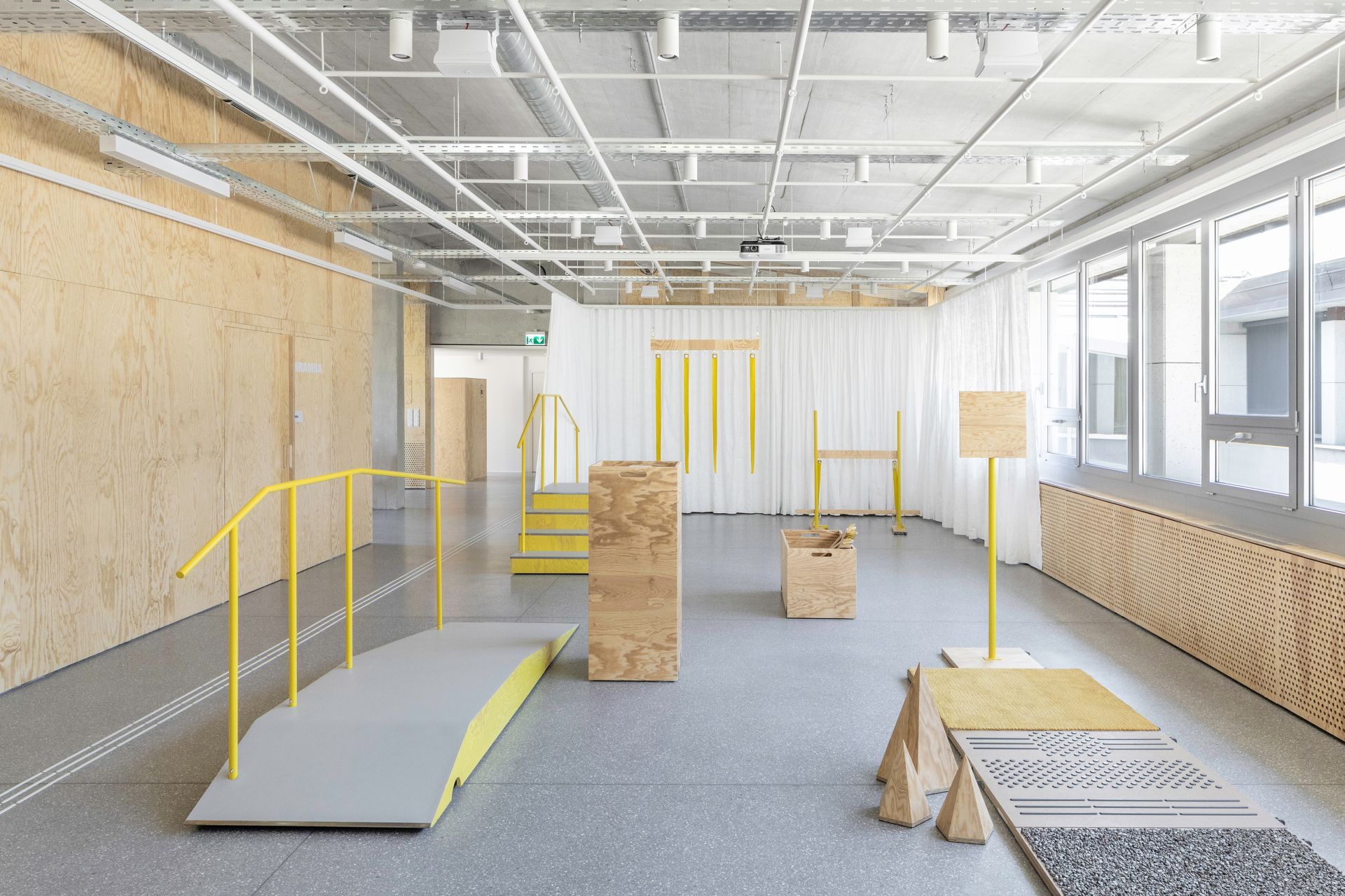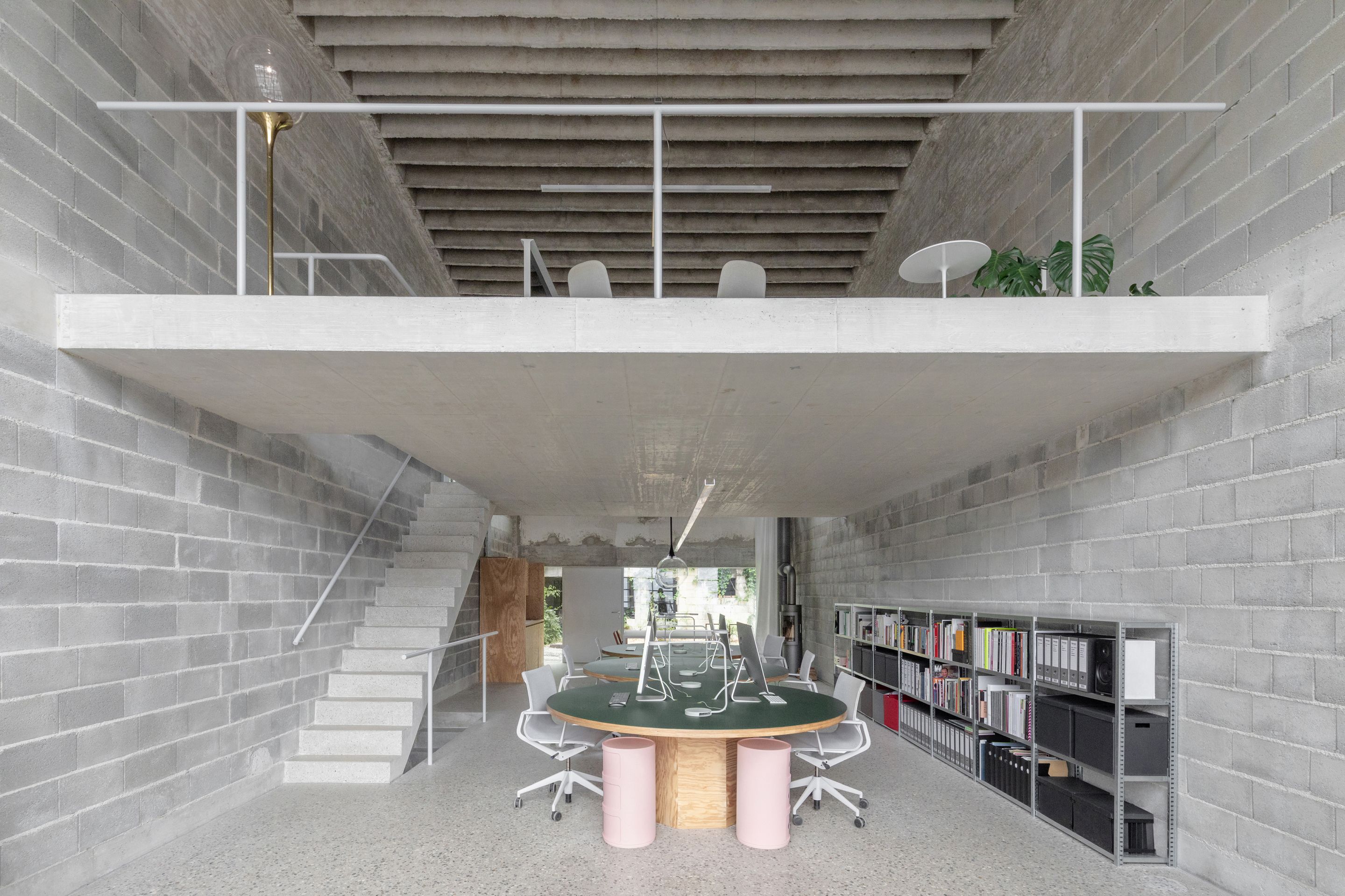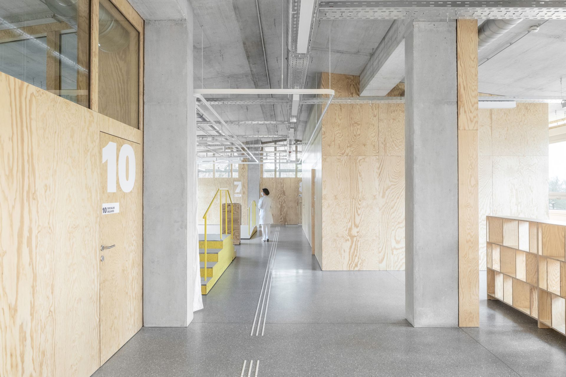 Če se v centru za rehabilitacijo prostorska intervencija zgodi z razporejanjem volumnov v tlorisu, skoraj brez odnosa do obstoječega ovoja, je oblikovalski studio Kabinet 01 oblikovan v prerezu. Betonska plošča je edini novi poseg med dvema industrijsko oblikovanima fasadama, ki ju arhitekti ohranijo in bežno dopolnijo, s tem pa priznavajo pomen in kakovost anonimne arhitekture.