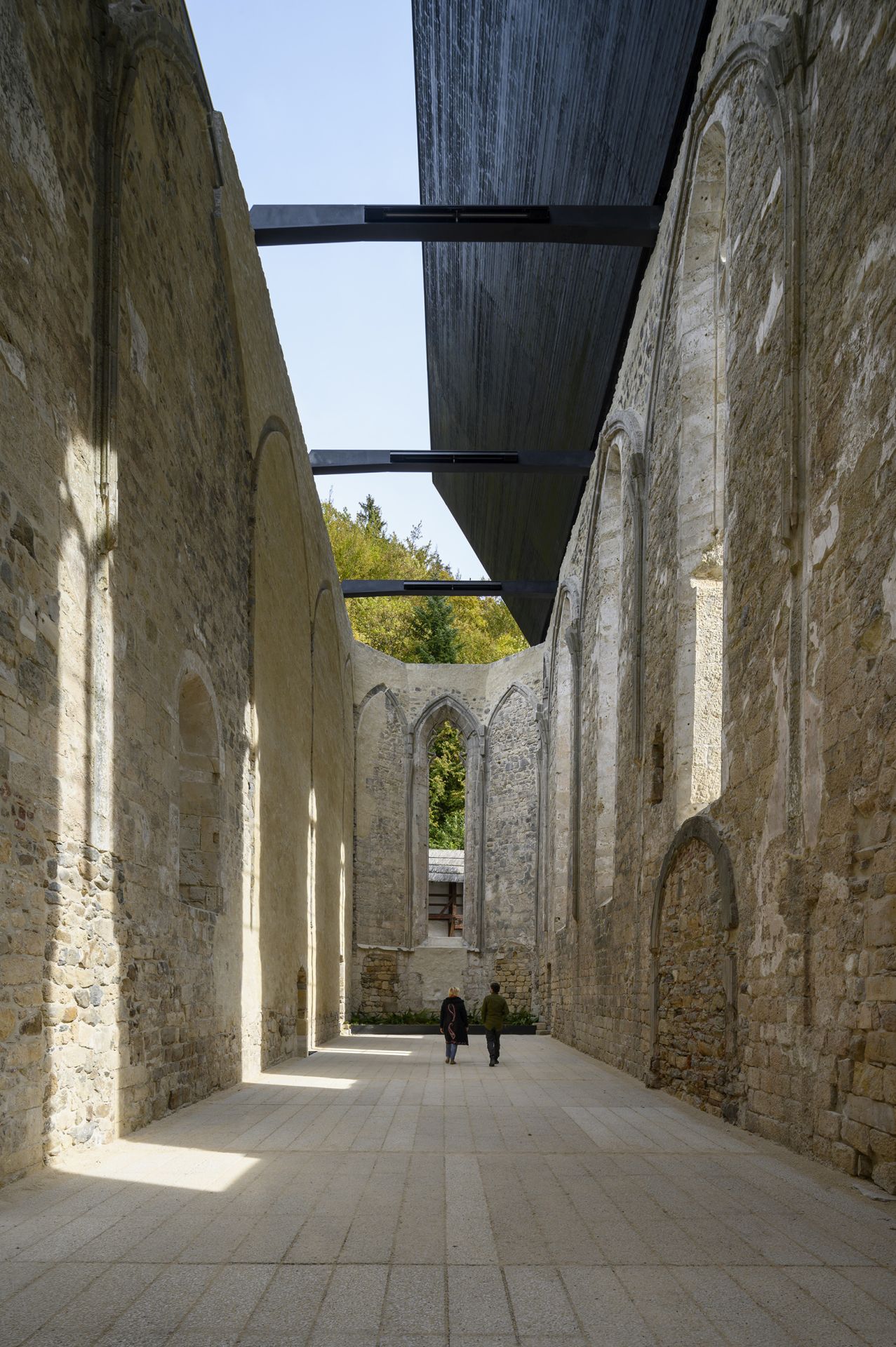 Projekt je inovativen in občutljiv. Pot, ki vodi obiskovalca, se razvija skozi postopno izkušnjo odkrivanja. Po postanku v cerkveni ladji stopi v neke vrste prostorsko zanko, ki obsega vzpon na vrh zidovja in nato rahel spust v ozek prehod do razglednega okna. Slednje ne stoji na naključnem mestu, temveč na stičišču ohranjene historične substance in nove pozidave. Na tej skrbno izbrani točki, ki razkriva pogled na še vedno zakopane samostanske zidove, se zaključi ves čas prisotni dialog med novim in starim.