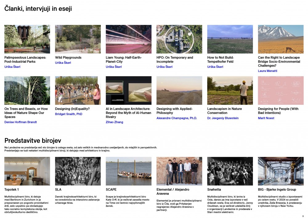 Landezine prek raznolikih projektov nagovarja tako mlajše kot tudi starejše, mednarodno uveljavljene predstavnike različnih skupin strokovne in splošne javnosti. Ne ustavi se pri nizanju primerov dobre prakse, temveč jih skozi dogodke, objave člankov, esejev in intervjujev, natečaje, pa tudi predstavitve kolektivov, posameznikov in produktov, raziskuje in razlaga, preizprašuje in vrednoti.