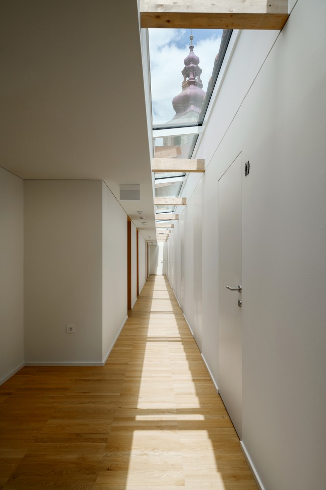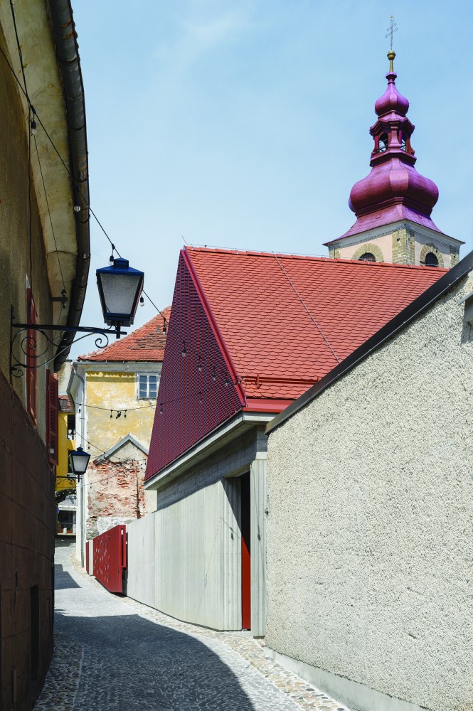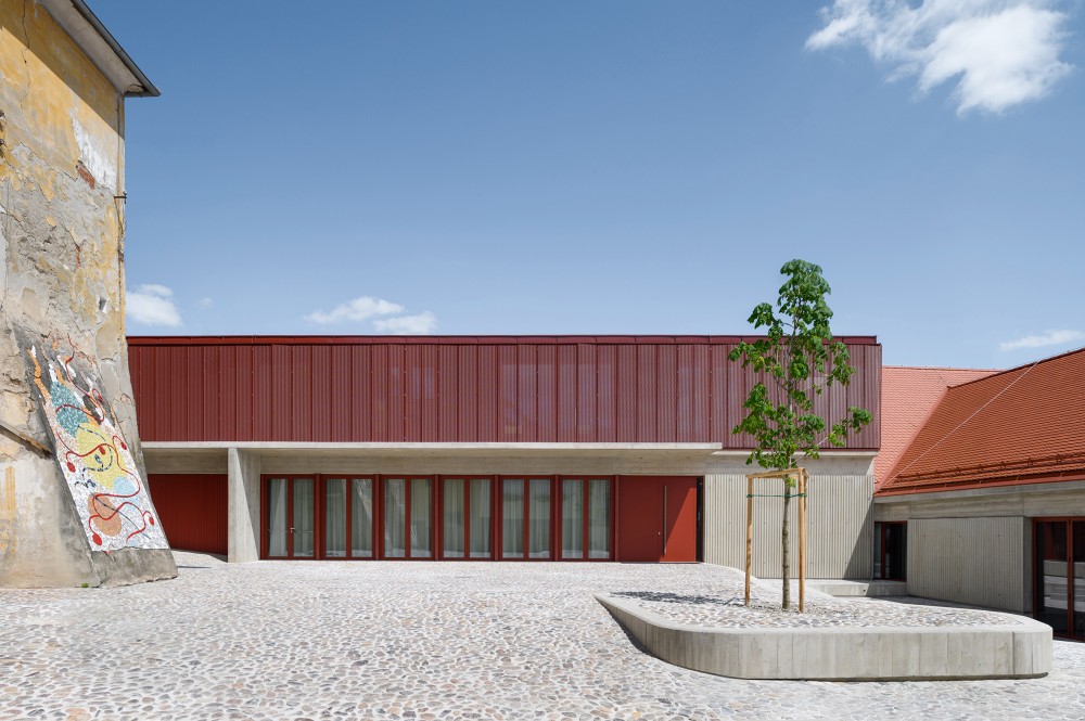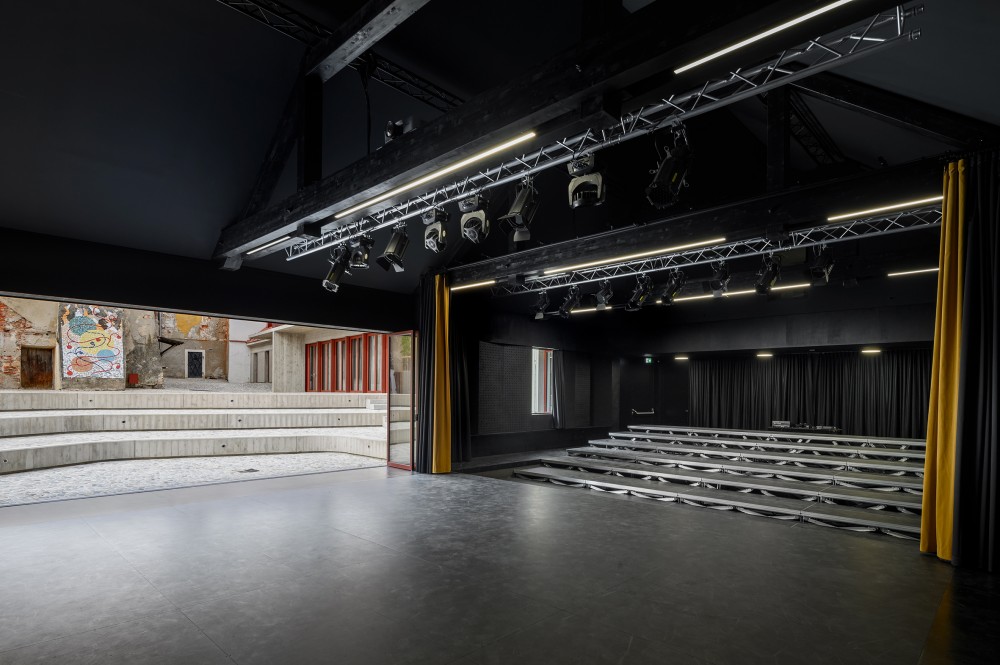 Na dvorišče se odpirata dve dvorani, pri čemer lahko oder večje občinstvo opazuje tudi iz zunanjega mini avditorija. Kar največjo fleksibilnost prireditvenih prostorov omogoča tudi prilagodljivost odrskih podestov velike dvorane, ki je sicer zasnovana v enotnem nivoju. Manjša dvorana deluje kot vmesni prostor med zunanjostjo in tretjo, staro dvorano, kar odraža tudi značaj njenega ambienta, ki vizualno nadaljuje prostor dvorišča v notranjost. Pri tem velja izpostaviti posebno občutljivost avtorjev za materialnost obstoječega prostora in njeno inovativno interpretacijo, ki pomensko nadgrajuje arhitekturno izkušnjo. V dvorani ločnica med novimi in starimi deskami na tleh dobi odziv na zidu in določa mejo med različnimi obravnavami teksture prenove; na stopnišču nas preseneti odtis nekdanjih stopnic; v nadstropju se odpre pogled na cerkveni zvonik; spet drugje stari zid pogleda na stopnišče. Tovrstnih fragmentov je veliko, a dojemanja prostora ne zasitijo, temveč ga plastijo in bogatijo.